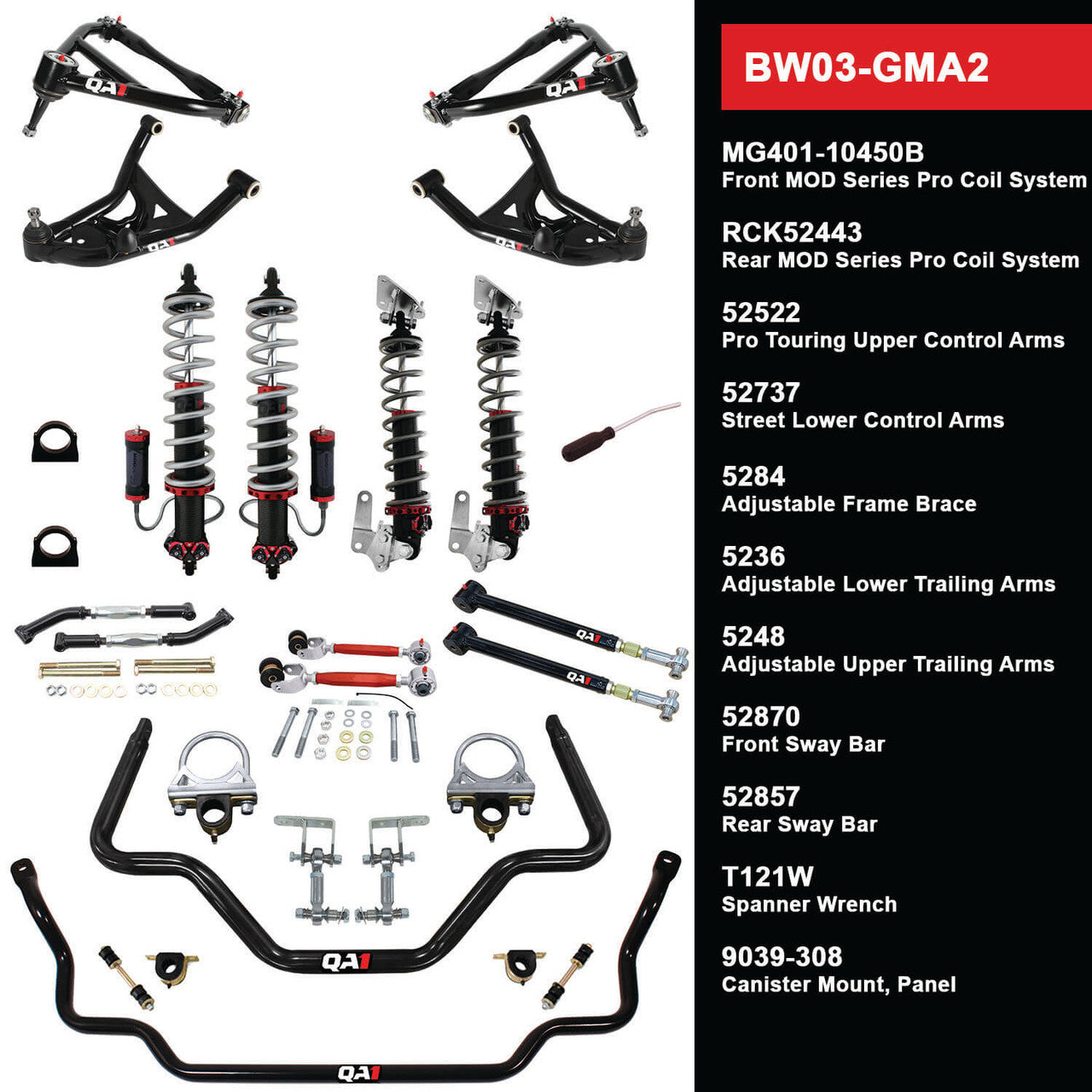 {"id":9060191600865,"title":"QA1 BW03-GMA2 Big Wheel Suspension Kit GM 1968-72 A-Body Level 3","handle":"qa1bw03-gma2","description":"\u003cp style=\"mso-margin-top-alt: auto; mso-margin-bottom-alt: auto; line-height: normal;\" class=\"MsoNormal\"\u003e\u003cspan style=\"font-size: 12pt; font-family: 'Times New Roman', serif; color: #000000;\"\u003eQA1 designed their BW03-GMA2 Big Wheel Level 3 Suspension Kit to fit the GM 1968-72 A-Body. Fit up to 24” wheels on your Chevelle, Malibu, GTO or Cutlass with this complete bolt-in suspension system. It includes everything you need to get your car sitting right while giving you a better ride!\u003c\/span\u003e\u003c\/p\u003e\n\u003cp style=\"mso-margin-top-alt: auto; mso-margin-bottom-alt: auto; line-height: normal;\" class=\"MsoNormal\"\u003e\u003cspan style=\"font-size: 12pt; font-family: 'Times New Roman', serif; color: #000000;\"\u003eThe front and rear coil-overs allow you to easily get the perfect stance. Dial in the exact style you want in minutes with the included spanner wrench. Enjoy maximum shock tunability with 4-way adjustable high and low-speed valving. Perfect for both street driving and drag racing, MOD Series shocks are the ultimate choice for maximizing your car's performance!\u003c\/span\u003e\u003c\/p\u003e\n\u003cp style=\"mso-margin-top-alt: auto; mso-margin-bottom-alt: auto; line-height: normal;\" class=\"MsoNormal\"\u003e\u003cspan style=\"font-size: 12pt; font-family: 'Times New Roman', serif; color: #000000;\"\u003eRaise your car 1\/2\" above stock ride height or up to 2\" lower than stock in the rear!\u003c\/span\u003e\u003c\/p\u003e\n\u003cp style=\"mso-margin-top-alt: auto; mso-margin-bottom-alt: auto; line-height: normal;\" class=\"MsoNormal\"\u003e\u003cspan style=\"font-size: 12pt; font-family: 'Times New Roman', serif; color: #000000;\"\u003eThe adjustable trailing arms center your rear axle in the wheel well, allowing your wheel\/tire combination to fit! \u003c\/span\u003e\u003cspan style=\"font-size: 12pt; font-family: 'Times New Roman', serif; color: #000000;\"\u003eParts come powder coated and ready to install with all necessary hardware. You can bolt up the kit right in your garage or work with your local shop. \u003c\/span\u003e\u003cspan style=\"font-size: 12pt; font-family: 'Times New Roman', serif; color: #000000;\"\u003eKits work with factory rear end housings.\u003c\/span\u003e\u003c\/p\u003e\n\u003ch3\u003e\u003cspan style=\"font-size: 12pt; font-family: 'Times New Roman', serif; color: #000000; text-decoration: underline;\"\u003eQA1 BW03-GMA2 Big Wheel Level 3 1968-72 A-Body Suspension Kit Includes:\u003c\/span\u003e\u003c\/h3\u003e\n\u003cul\u003e\n\u003cli style=\"color: black; mso-margin-top-alt: auto; mso-margin-bottom-alt: auto; line-height: normal; mso-list: l0 level1 lfo1; tab-stops: list .5in;\" class=\"MsoNormal\"\u003e\u003cspan style=\"font-size: 12pt; font-family: 'Times New Roman', serif; color: #000000;\"\u003eMG401-10450B Front MOD Series Pro Coil System\u003c\/span\u003e\u003c\/li\u003e\n\u003cli style=\"color: black; mso-margin-top-alt: auto; mso-margin-bottom-alt: auto; line-height: normal; mso-list: l0 level1 lfo1; tab-stops: list .5in;\" class=\"MsoNormal\"\u003e\u003cspan style=\"font-size: 12pt; font-family: 'Times New Roman', serif; color: #000000;\"\u003eRCK52443 Rear MOD Series Pro Coil System\u003c\/span\u003e\u003c\/li\u003e\n\u003cli style=\"color: black; mso-margin-top-alt: auto; mso-margin-bottom-alt: auto; line-height: normal; mso-list: l0 level1 lfo1; tab-stops: list .5in;\" class=\"MsoNormal\"\u003e\u003cspan style=\"font-size: 12pt; font-family: 'Times New Roman', serif; color: #000000;\"\u003e52522 Pro Touring Upper Control Arms\u003c\/span\u003e\u003c\/li\u003e\n\u003cli style=\"color: black; mso-margin-top-alt: auto; mso-margin-bottom-alt: auto; line-height: normal; mso-list: l0 level1 lfo1; tab-stops: list .5in;\" class=\"MsoNormal\"\u003e\u003cspan style=\"font-size: 12pt; font-family: 'Times New Roman', serif; color: #000000;\"\u003e52737 Street Lower Control Arms\u003c\/span\u003e\u003c\/li\u003e\n\u003cli style=\"color: black; mso-margin-top-alt: auto; mso-margin-bottom-alt: auto; line-height: normal; mso-list: l0 level1 lfo1; tab-stops: list .5in;\" class=\"MsoNormal\"\u003e\u003cspan style=\"font-size: 12pt; font-family: 'Times New Roman', serif; color: #000000;\"\u003e5284 Adjustable Frame Brace\u003c\/span\u003e\u003c\/li\u003e\n\u003cli style=\"color: black; mso-margin-top-alt: auto; mso-margin-bottom-alt: auto; line-height: normal; mso-list: l0 level1 lfo1; tab-stops: list .5in;\" class=\"MsoNormal\"\u003e\u003cspan style=\"font-size: 12pt; font-family: 'Times New Roman', serif; color: #000000;\"\u003e5236 Adjustable Lower Trailing Arms\u003c\/span\u003e\u003c\/li\u003e\n\u003cli style=\"color: black; mso-margin-top-alt: auto; mso-margin-bottom-alt: auto; line-height: normal; mso-list: l0 level1 lfo1; tab-stops: list .5in;\" class=\"MsoNormal\"\u003e\u003cspan style=\"font-size: 12pt; font-family: 'Times New Roman', serif; color: #000000;\"\u003e5248 Adjustable Upper Trailing Arms\u003c\/span\u003e\u003c\/li\u003e\n\u003cli style=\"color: black; mso-margin-top-alt: auto; mso-margin-bottom-alt: auto; line-height: normal; mso-list: l0 level1 lfo1; tab-stops: list .5in;\" class=\"MsoNormal\"\u003e\u003cspan style=\"font-size: 12pt; font-family: 'Times New Roman', serif; color: #000000;\"\u003e52870 Front Sway Bar\u003c\/span\u003e\u003c\/li\u003e\n\u003cli style=\"color: black; mso-margin-top-alt: auto; mso-margin-bottom-alt: auto; line-height: normal; mso-list: l0 level1 lfo1; tab-stops: list .5in;\" class=\"MsoNormal\"\u003e\u003cspan style=\"font-size: 12pt; font-family: 'Times New Roman', serif; color: #000000;\"\u003e52857 Rear Sway Bar\u003c\/span\u003e\u003c\/li\u003e\n\u003cli style=\"color: black; mso-margin-top-alt: auto; mso-margin-bottom-alt: auto; line-height: normal; mso-list: l0 level1 lfo1; tab-stops: list .5in;\" class=\"MsoNormal\"\u0