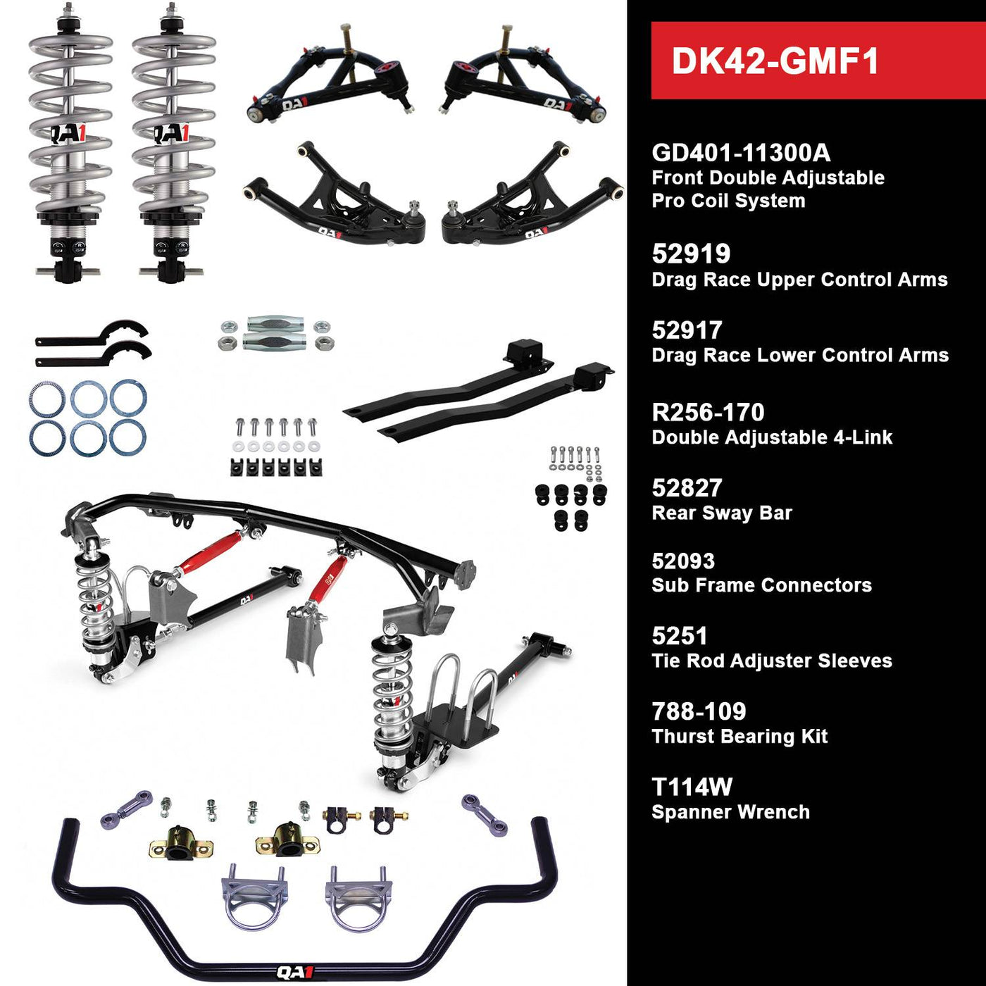{"id":8319168381153,"title":"QA1 DK42-GMF1 Drag Kit Level 2 GM F-Body 1967-69","handle":"qa1dk42-gmf1","description":"\u003cp style=\"mso-margin-top-alt: auto; mso-margin-bottom-alt: auto; line-height: normal;\" class=\"MsoNormal\"\u003e\u003cspan style=\"font-size: 12pt; font-family: 'Times New Roman', serif; color: #000000;\"\u003eQA1 designed their DK42-GMF1 Drag Racing Level 2 Suspension Kit as a complete solution for F-body owners who drag race their car. This kit replaces your entire front and rear suspension, optimizing your car for weight transfer and straight-line performance. The coilovers offer adjustable ride height, while the rear suspension was designed for wider wheels and tires.\u003c\/span\u003e\u003c\/p\u003e\n\u003cp style=\"mso-margin-top-alt: auto; mso-margin-bottom-alt: auto; line-height: normal;\" class=\"MsoNormal\"\u003e\u003cspan style=\"font-size: 12pt; font-family: 'Times New Roman', serif; color: #000000;\"\u003eQA1's tubular front control arms are some of the lightest available. Racers also have the flexibility to fine-tune launch characteristics using an adjustable droop stop. Low-friction ball joints and ultra-low-friction composite bushings enhance weight transfer, ensuring smooth and bind-free movement. When paired with QA1's double adjustable Pro-Coil coilovers, this kit offers plenty of control over front-end movement.\u003c\/span\u003e\u003c\/p\u003e\n\u003cp style=\"mso-margin-top-alt: auto; mso-margin-bottom-alt: auto; line-height: normal;\" class=\"MsoNormal\"\u003e\u003cspan style=\"font-size: 12pt; font-family: 'Times New Roman', serif; color: #000000;\"\u003eThis kit provides 0 to -2 inches of adjustability in the front and +2 to -3 inches of ride height adjustability in the rear, letting you dial in exactly the look you want.\u003c\/span\u003e\u003c\/p\u003e\n\u003cp style=\"mso-margin-top-alt: auto; mso-margin-bottom-alt: auto; line-height: normal;\" class=\"MsoNormal\"\u003e\u003cspan style=\"font-size: 12pt; font-family: 'Times New Roman', serif; color: #000000;\"\u003eDesigned to work with both standard and mini-tubs, this system offers generous clearance for up to 11” wide wheels on ’67-’68 F-bodies and 12” wide wheels on your ’69. This enables you to choose the appropriate tire for the class you race, or street\/strip combination.\u003c\/span\u003e\u003c\/p\u003e\n\u003cp style=\"mso-margin-top-alt: auto; mso-margin-bottom-alt: auto; line-height: normal;\" class=\"MsoNormal\"\u003e\u003cspan style=\"font-size: 12pt; font-family: 'Times New Roman', serif; color: #000000;\"\u003ePerfect for both street and track use, double adjustable shocks are famous for their independent rebound and compression tunability, giving you exceptional off-the-line control for improved 60-foot times.\u003c\/span\u003e\u003c\/p\u003e\n\u003cp style=\"mso-margin-top-alt: auto; mso-margin-bottom-alt: auto; line-height: normal;\" class=\"MsoNormal\"\u003e\u003cspan style=\"color: #000000;\"\u003e\u003cspan style=\"font-size: 12pt; font-family: 'Times New Roman', serif;\"\u003eThoughtful design meets effortless installation as well as requiring minimal welding. You'll experience a painless installation as well as setup process. Adjusting ride height, pinion angle in addition to wheelbase is as simple as a few tweaks – no link removal required. No modifications to the floor pan required.\u003c\/span\u003e\u003cspan style=\"font-size: 12.0pt; font-family: 'Times New Roman',serif;\"\u003e\u003c\/span\u003e\u003c\/span\u003e\u003c\/p\u003e\n\u003ch3 style=\"mso-margin-top-alt: auto; mso-margin-bottom-alt: auto; line-height: normal; mso-outline-level: 3;\" class=\"MsoNormal\"\u003e\u003cspan style=\"color: #000000;\"\u003e\u003cb\u003e\u003cu\u003e\u003cspan style=\"font-size: 12pt; font-family: 'Times New Roman', serif;\"\u003eQA1 DK42-GMF1 Drag Racing Level 2 1967-69 GM F-Body Suspension Kit Includes:\u003c\/span\u003e\u003c\/u\u003e\u003c\/b\u003e\u003cb\u003e\u003cspan style=\"font-size: 13.5pt; font-family: 'Times New Roman',serif; mso-fareast-font-family: 'Times New Roman';\"\u003e\u003c\/span\u003e\u003c\/b\u003e\u003c\/span\u003e\u003c\/h3\u003e\n\u003cul type=\"disc\"\u003e\n\u003cli style=\"color: black; mso-margin-top-alt: auto; mso-margin-bottom-alt: auto; line-height: normal; mso-list: l0 level1 lfo1; tab-stops: list .5in;\" class=\"MsoNormal\"\u003e\u003cspan style=\"font-size: 12pt; font-family: 'Times New Roman', serif; color: #000000;\"\u003eGD401-11300A Front Double Adjustable Pro Coil System\u003c\/span\u003e\u003c\/li\u003e\n\u003cli style=\"color: black; mso-margin-top-alt: auto; mso-margin-bottom-alt: auto; line-height: normal; mso-list: l0 level1 lfo1; tab-stops: list .5in;\" class=\"MsoNormal\"\u003e\u003cspan style=\"font-size: 12pt; font-family: 'Times New Roman', serif; color: #000000;\"\u003e52919 Drag Race Upper Control Arms\u003c\/span\u003e\u003c\/li\u003e\n\u003cli style=\"color: black; mso-margin-top-alt: auto; mso-margin-bottom-alt: auto; line-height: normal; mso-list: l0 level1 lfo1; tab-stops: list .5in;\" class=\"MsoNormal\"\u003e\u003cspan style=\"font-size: 12pt; font-family: 'Times New Roman', serif; color: #000000;\"\u003e52917 Drag Race Lower Control Arms\u003c\/span\u003e\u003c\/li\u003e\n\u003cli style=\"color: black; mso-margin-top-alt: auto; mso-margin-bottom-alt: auto; line-height: normal; mso-list: l0 level1 lfo1; tab-stops: list .5in;\" class=\"MsoNormal\"\u003e\u003cspan style=\"font-size: 12pt; font-family: 'Times New Roman', serif; color: #000000;\"\u003eR256-170 Double Adjustable 4-Link\u003c\/span\u003e\u003c\/li\u003e\n\u003cli style=\"color: black; mso-margin-top-alt: auto; mso-margin-bottom-alt: auto; line-height: normal; mso-list: l0 level1 lfo1; tab-stops: list .5in;\" class=\"MsoNormal\"\u003e\u003cspan style=\"font-size: 12pt; font-family: 'Times New Roman', serif; color: #000000;\"\u003e52827 Rear Sway Bar\u003c\/span\u003e\u003c\/li\u003e\n\u003cli style=\"color: black; mso-margin-top-alt: auto; m
