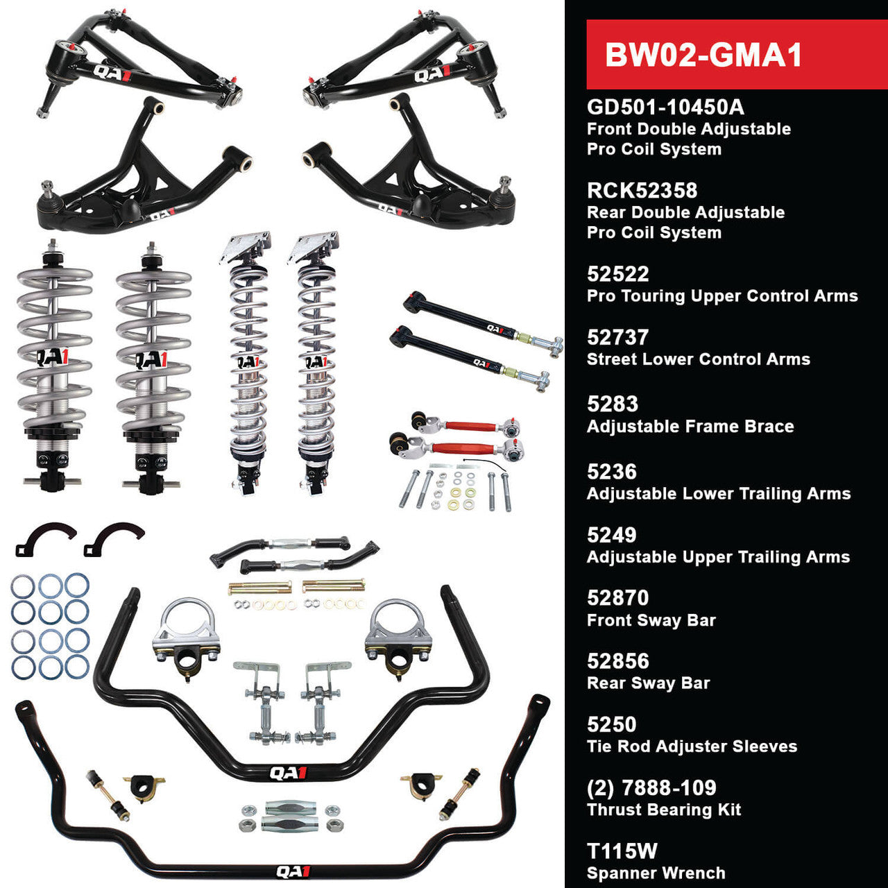 {"id":8855197909217,"title":"QA1 BW02-GMA1 Big Wheel Suspension Kit GM 1964-67 A-Body Level 2","handle":"qa1-bw02-gma1","description":"\u003cp style=\"mso-margin-top-alt: auto; mso-margin-bottom-alt: auto; line-height: normal;\" class=\"MsoNormal\"\u003e\u003cspan style=\"font-size: 12pt; font-family: 'Times New Roman', serif; color: #000000;\"\u003eQA1 designed their BW02-GMA1 Big Wheel Level 2 Suspension Kit to fit the GM 1964-67 A-Body. Fit up to 22” wheels on your Chevelle, Malibu, GTO or Cutlass with this complete bolt-in suspension system. It includes everything you need to get your car sitting right while giving you a better ride!\u003c\/span\u003e\u003c\/p\u003e\n\u003cp style=\"mso-margin-top-alt: auto; mso-margin-bottom-alt: auto; line-height: normal;\" class=\"MsoNormal\"\u003e\u003cspan style=\"font-size: 12pt; font-family: 'Times New Roman', serif; color: #000000;\"\u003eThe front and rear coil-overs allow you to easily get the perfect stance. Dial in the exact style you want in minutes with the included spanner wrench. Double adjustable shocks allow independent tuning of your shock compression as well as rebound to get the perfect ride or get more grip off the line for drag racing.\u003c\/span\u003e\u003c\/p\u003e\n\u003cp style=\"mso-margin-top-alt: auto; mso-margin-bottom-alt: auto; line-height: normal;\" class=\"MsoNormal\"\u003e\u003cspan style=\"font-size: 12pt; font-family: 'Times New Roman', serif; color: #000000;\"\u003eRaise your car 1\/2\" above stock ride height or up to 2\" lower than stock in the rear!\u003c\/span\u003e\u003c\/p\u003e\n\u003cp style=\"mso-margin-top-alt: auto; mso-margin-bottom-alt: auto; line-height: normal;\" class=\"MsoNormal\"\u003e\u003cspan style=\"font-size: 12pt; font-family: 'Times New Roman', serif; color: #000000;\"\u003eThe adjustable trailing arms center your rear axle in the wheel well, allowing your wheel\/tire combination to fit! \u003c\/span\u003e\u003cspan style=\"font-size: 12pt; font-family: 'Times New Roman', serif; color: #000000;\"\u003eParts come powder coated and ready to install with all necessary hardware. You can bolt up the kit right in your garage or work with your local shop. \u003c\/span\u003e\u003cspan style=\"font-size: 12pt; font-family: 'Times New Roman', serif; color: #000000;\"\u003eKits work with factory rear end housings.\u003c\/span\u003e\u003c\/p\u003e\n\u003ch3\u003e\u003cspan style=\"font-size: 12pt; font-family: 'Times New Roman', serif; color: #000000; text-decoration: underline;\"\u003eQA1 BW02-GMA1 Big Wheel Level 2 1964-67 A-Body Suspension Kit Includes:\u003c\/span\u003e\u003c\/h3\u003e\n\u003cul\u003e\n\u003cli style=\"color: black; mso-margin-top-alt: auto; mso-margin-bottom-alt: auto; line-height: normal; mso-list: l0 level1 lfo1; tab-stops: list .5in;\" class=\"MsoNormal\"\u003e\u003cspan style=\"font-size: 12pt; font-family: 'Times New Roman', serif; color: #000000;\"\u003eGD501-10450A Front Double Adjustable Pro Coil System\u003c\/span\u003e\u003c\/li\u003e\n\u003cli style=\"color: black; mso-margin-top-alt: auto; mso-margin-bottom-alt: auto; line-height: normal; mso-list: l0 level1 lfo1; tab-stops: list .5in;\" class=\"MsoNormal\"\u003e\u003cspan style=\"font-size: 12pt; font-family: 'Times New Roman', serif; color: #000000;\"\u003eRCK52358 Rear Double Adjustable Pro Coil System\u003c\/span\u003e\u003c\/li\u003e\n\u003cli style=\"color: black; mso-margin-top-alt: auto; mso-margin-bottom-alt: auto; line-height: normal; mso-list: l0 level1 lfo1; tab-stops: list .5in;\" class=\"MsoNormal\"\u003e\u003cspan style=\"font-size: 12pt; font-family: 'Times New Roman', serif; color: #000000;\"\u003e52522 Pro Touring Upper Control Arms\u003c\/span\u003e\u003c\/li\u003e\n\u003cli style=\"color: black; mso-margin-top-alt: auto; mso-margin-bottom-alt: auto; line-height: normal; mso-list: l0 level1 lfo1; tab-stops: list .5in;\" class=\"MsoNormal\"\u003e\u003cspan style=\"font-size: 12pt; font-family: 'Times New Roman', serif; color: #000000;\"\u003e52737 Street Lower Control Arms\u003c\/span\u003e\u003c\/li\u003e\n\u003cli style=\"color: black; mso-margin-top-alt: auto; mso-margin-bottom-alt: auto; line-height: normal; mso-list: l0 level1 lfo1; tab-stops: list .5in;\" class=\"MsoNormal\"\u003e\u003cspan style=\"font-size: 12pt; font-family: 'Times New Roman', serif; color: #000000;\"\u003e5283 Adjustable Frame Brace\u003c\/span\u003e\u003c\/li\u003e\n\u003cli style=\"color: black; mso-margin-top-alt: auto; mso-margin-bottom-alt: auto; line-height: normal; mso-list: l0 level1 lfo1; tab-stops: list .5in;\" class=\"MsoNormal\"\u003e\u003cspan style=\"font-size: 12pt; font-family: 'Times New Roman', serif; color: #000000;\"\u003e5236 Adjustable Lower Trailing Arms\u003c\/span\u003e\u003c\/li\u003e\n\u003cli style=\"color: black; mso-margin-top-alt: auto; mso-margin-bottom-alt: auto; line-height: normal; mso-list: l0 level1 lfo1; tab-stops: list .5in;\" class=\"MsoNormal\"\u003e\u003cspan style=\"font-size: 12pt; font-family: 'Times New Roman', serif; color: #000000;\"\u003e5249 Adjustable Upper Trailing Arms\u003c\/span\u003e\u003c\/li\u003e\n\u003cli style=\"color: black; mso-margin-top-alt: auto; mso-margin-bottom-alt: auto; line-height: normal; mso-list: l0 level1 lfo1; tab-stops: list .5in;\" class=\"MsoNormal\"\u003e\u003cspan style=\"font-size: 12pt; font-family: 'Times New Roman', serif; color: #000000;\"\u003e52870 Front Sway Bar\u003c\/span\u003e\u003c\/li\u003e\n\u003cli style=\"color: black; mso-margin-top-alt: auto; mso-margin-bottom-alt: auto; line-height: normal; mso-list: l0 level1 lfo1; tab-stops: list .5in;\" class=\"MsoNormal\"\u003e\u003cspan style=\"font-size: 12pt; font-family: 'Times New Roman', serif; color: #000000;\"\u003e52856 Rear Sway Bar\u003c\/span\u003e\u003c\/li\u003e\n\u003cli style=\"color: black; mso-margin-top-alt: auto; mso-margin-bottom-alt: auto; line-height: normal; mso-list: l0 level1 lfo1; tab-stops: list .5in;\" class=\"MsoNormal\"\u003e\u003cspan style=\"font-siz
