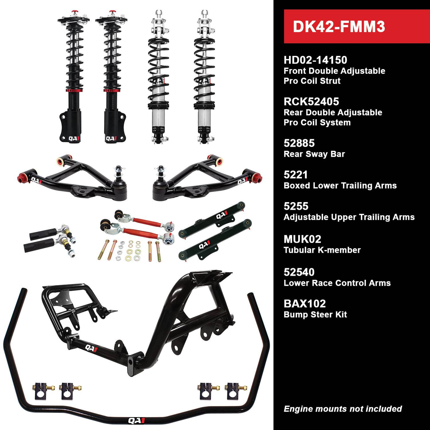 {"id":8180139065569,"title":"QA1 DK42-FMM3 Drag Kit Level 2 Ford Mustang 1990-93","handle":"qa1dk42-fmm3","description":"\u003cp style=\"mso-margin-top-alt: auto; mso-margin-bottom-alt: auto; line-height: normal;\" class=\"MsoNormal\"\u003e\u003cspan style=\"font-size: 12pt; font-family: 'Times New Roman', serif; color: #000000;\"\u003eQA1 designed their DK42-FMM3 Drag Racing Level 2 Suspension Kit as a serious upgrade to fit the 1990-1993 Ford Mustang. This Level 2 drag racing kit includes a lightweight tubular K-member, drag race control arms, boxed trailing arms, rear sway bar, and front and rear double adjustable coilovers. \u003c\/span\u003e\u003c\/p\u003e\n\u003cp style=\"mso-margin-top-alt: auto; mso-margin-bottom-alt: auto; line-height: normal;\" class=\"MsoNormal\"\u003e\u003cspan style=\"font-size: 12pt; font-family: 'Times New Roman', serif; color: #000000;\"\u003eThe tubular K-member is designed to save weight and free up room in your engine bay. Weighing only 25lbs., it's 50% lighter than stock K-members and boasts improved geometry and durability. Interchangeable engine mounts, sold separately, offer flexibility for running factory or late model engines including Coyotes.\u003c\/span\u003e\u003c\/p\u003e\n\u003cp style=\"mso-margin-top-alt: auto; mso-margin-bottom-alt: auto; line-height: normal;\" class=\"MsoNormal\"\u003e\u003cspan style=\"font-size: 12pt; font-family: 'Times New Roman', serif; color: #000000;\"\u003eThe front struts feature an inverted cartridge design, large diameter shaft, in addition to lightweight aluminum body for improved suspension performance. The lightweight, high-travel springs with proven spring rates optimize weight transfer, reducing 60-foot times and ET’s.\u003c\/span\u003e\u003c\/p\u003e\n\u003cp style=\"mso-margin-top-alt: auto; mso-margin-bottom-alt: auto; line-height: normal;\" class=\"MsoNormal\"\u003e\u003cspan style=\"font-size: 12pt; font-family: 'Times New Roman', serif; color: #000000;\"\u003eThese kits offer up to 2\" lower than stock ride height adjustment to dial in the perfect stance!\u003c\/span\u003e\u003c\/p\u003e\n\u003cp style=\"mso-margin-top-alt: auto; mso-margin-bottom-alt: auto; line-height: normal;\" class=\"MsoNormal\"\u003e\u003cspan style=\"font-size: 12pt; font-family: 'Times New Roman', serif; color: #000000;\"\u003eAluminum caster camber plates improve handling and performance. Lighter and sleeker than steel, they offer precision adjustment to fine-tune suspension geometry for straight line stability.\u003c\/span\u003e\u003c\/p\u003e\n\u003cp style=\"mso-margin-top-alt: auto; mso-margin-bottom-alt: auto; line-height: normal;\" class=\"MsoNormal\"\u003e\u003cspan style=\"font-size: 12pt; font-family: 'Times New Roman', serif; color: #000000;\"\u003eDouble-adjustable rear coilovers are great for serious track cars looking to further tune their rear suspension. Tubular control arms, trailing arms, as well as rear sway bars solve flexing and bushing bind, allowing smoother suspension movement and straighter launches.\u003c\/span\u003e\u003c\/p\u003e\n\u003ch3 style=\"mso-margin-top-alt: auto; mso-margin-bottom-alt: auto; line-height: normal; mso-outline-level: 3;\" class=\"MsoNormal\"\u003e\u003cspan style=\"color: #000000;\"\u003e\u003cb\u003e\u003cu\u003e\u003cspan style=\"font-size: 12pt; font-family: 'Times New Roman', serif;\"\u003eQA1 DK42-FMM3 Drag Racing Level 2 1990-93 Ford Mustang Suspension Kit Includes:\u003c\/span\u003e\u003c\/u\u003e\u003c\/b\u003e\u003cb\u003e\u003cspan style=\"font-size: 13.5pt; font-family: 'Times New Roman',serif; mso-fareast-font-family: 'Times New Roman';\"\u003e\u003c\/span\u003e\u003c\/b\u003e\u003c\/span\u003e\u003c\/h3\u003e\n\u003cul type=\"disc\"\u003e\n\u003cli style=\"color: black; mso-margin-top-alt: auto; mso-margin-bottom-alt: auto; line-height: normal; mso-list: l0 level1 lfo1; tab-stops: list .5in;\" class=\"MsoNormal\"\u003e\u003cspan style=\"font-size: 12pt; font-family: 'Times New Roman', serif; color: #000000;\"\u003eHD02-14150 Front Double Adjustable Pro Coil Struts\u003c\/span\u003e\u003c\/li\u003e\n\u003cli style=\"color: black; mso-margin-top-alt: auto; mso-margin-bottom-alt: auto; line-height: normal; mso-list: l0 level1 lfo1; tab-stops: list .5in;\" class=\"MsoNormal\"\u003e\u003cspan style=\"font-size: 12pt; font-family: 'Times New Roman', serif; color: #000000;\"\u003eRCK52405 Rear Double Adjustable Pro Coil System\u003c\/span\u003e\u003c\/li\u003e\n\u003cli style=\"color: black; mso-margin-top-alt: auto; mso-margin-bottom-alt: auto; line-height: normal; mso-list: l0 level1 lfo1; tab-stops: list .5in;\" class=\"MsoNormal\"\u003e\u003cspan style=\"font-size: 12pt; font-family: 'Times New Roman', serif; color: #000000;\"\u003e52885 Rear Sway Bar\u003c\/span\u003e\u003c\/li\u003e\n\u003cli style=\"color: black; mso-margin-top-alt: auto; mso-margin-bottom-alt: auto; line-height: normal; mso-list: l0 level1 lfo1; tab-stops: list .5in;\" class=\"MsoNormal\"\u003e\u003cspan style=\"font-size: 12pt; font-family: 'Times New Roman', serif; color: #000000;\"\u003e5221 Boxed Lower Trailing Arms\u003c\/span\u003e\u003c\/li\u003e\n\u003cli style=\"color: black; mso-margin-top-alt: auto; mso-margin-bottom-alt: auto; line-height: normal; mso-list: l0 level1 lfo1; tab-stops: list .5in;\" class=\"MsoNormal\"\u003e\u003cspan style=\"font-size: 12pt; font-family: 'Times New Roman', serif; color: #000000;\"\u003e5255 Adjustable Upper Trailing Arms\u003c\/span\u003e\u003c\/li\u003e\n\u003cli style=\"color: black; mso-margin-top-alt: auto; mso-margin-bottom-alt: auto; line-height: normal; mso-list: l0 level1 lfo1; tab-stops: list .5in;\" class=\"MsoNormal\"\u003e\u003cspan style=\"font-size: 12pt; font-family: 'Times New Roman', serif; color: #000000;\"\u003eMUK02 Tubular K-member\u003c\/span\u003e\u003c\/li\u003e\n\u003cli style=\"color: black; mso-margin-top-alt: auto; mso-margin-bottom-alt: auto; line-height: normal; mso-list: l0 level1 lfo1; tab-stops: list .5in;\" class=