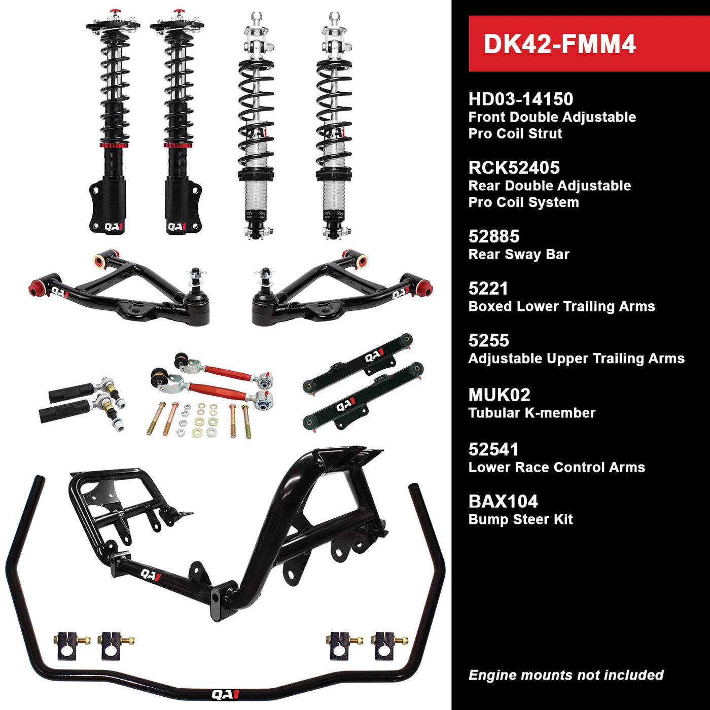 {"id":8180139131105,"title":"QA1 DK42-FMM4 Drag Kit Level 2 Ford Mustang 1994-2004","handle":"qa1dk42-fmm4","description":"\u003cp style=\"mso-margin-top-alt: auto; mso-margin-bottom-alt: auto; line-height: normal;\" class=\"MsoNormal\"\u003e\u003cspan style=\"font-size: 12pt; font-family: 'Times New Roman', serif; color: #000000;\"\u003eQA1 designed their DK42-FMM4 Drag Racing Level 2 Suspension Kit as a serious upgrade to fit the 1994-2004 Ford Mustang. This Level 2 drag racing kit includes a lightweight tubular K-member, drag race control arms, boxed trailing arms, rear sway bar, and front and rear double adjustable coilovers. \u003c\/span\u003e\u003c\/p\u003e\n\u003cp style=\"mso-margin-top-alt: auto; mso-margin-bottom-alt: auto; line-height: normal;\" class=\"MsoNormal\"\u003e\u003cspan style=\"font-size: 12pt; font-family: 'Times New Roman', serif; color: #000000;\"\u003eThe tubular K-member is designed to save weight and free up room in your engine bay. Weighing only 25lbs., it's 50% lighter than stock K-members and boasts improved geometry and durability. Interchangeable engine mounts, sold separately, offer flexibility for running factory or late model engines including Coyotes.\u003c\/span\u003e\u003c\/p\u003e\n\u003cp style=\"mso-margin-top-alt: auto; mso-margin-bottom-alt: auto; line-height: normal;\" class=\"MsoNormal\"\u003e\u003cspan style=\"font-size: 12pt; font-family: 'Times New Roman', serif; color: #000000;\"\u003eThe front struts feature an inverted cartridge design, large diameter shaft, in addition to lightweight aluminum body for improved suspension performance. The lightweight, high-travel springs with proven spring rates optimize weight transfer, reducing 60-foot times and ET’s.\u003c\/span\u003e\u003c\/p\u003e\n\u003cp style=\"mso-margin-top-alt: auto; mso-margin-bottom-alt: auto; line-height: normal;\" class=\"MsoNormal\"\u003e\u003cspan style=\"font-size: 12pt; font-family: 'Times New Roman', serif; color: #000000;\"\u003eThese kits offer up to 2\" lower than stock ride height adjustment to dial in the perfect stance!\u003c\/span\u003e\u003c\/p\u003e\n\u003cp style=\"mso-margin-top-alt: auto; mso-margin-bottom-alt: auto; line-height: normal;\" class=\"MsoNormal\"\u003e\u003cspan style=\"font-size: 12pt; font-family: 'Times New Roman', serif; color: #000000;\"\u003eAluminum caster camber plates improve handling and performance. Lighter and sleeker than steel, they offer precision adjustment to fine-tune suspension geometry for straight line stability.\u003c\/span\u003e\u003c\/p\u003e\n\u003cp style=\"mso-margin-top-alt: auto; mso-margin-bottom-alt: auto; line-height: normal;\" class=\"MsoNormal\"\u003e\u003cspan style=\"font-size: 12pt; font-family: 'Times New Roman', serif; color: #000000;\"\u003eDouble-adjustable rear coilovers are great for serious track cars looking to further tune their rear suspension. Tubular control arms, trailing arms, as well as rear sway bars solve flexing and bushing bind, allowing smoother suspension movement and straighter launches.\u003c\/span\u003e\u003c\/p\u003e\n\u003ch3 style=\"mso-margin-top-alt: auto; mso-margin-bottom-alt: auto; line-height: normal; mso-outline-level: 3;\" class=\"MsoNormal\"\u003e\u003cspan style=\"color: #000000;\"\u003e\u003cb\u003e\u003cu\u003e\u003cspan style=\"font-size: 12pt; font-family: 'Times New Roman', serif;\"\u003eQA1 DK42-FMM4 Drag Racing Level 2 1994-2004 Ford Mustang Suspension Kit Includes:\u003c\/span\u003e\u003c\/u\u003e\u003c\/b\u003e\u003cb\u003e\u003cspan style=\"font-size: 13.5pt; font-family: 'Times New Roman',serif; mso-fareast-font-family: 'Times New Roman';\"\u003e\u003c\/span\u003e\u003c\/b\u003e\u003c\/span\u003e\u003c\/h3\u003e\n\u003cul type=\"disc\"\u003e\n\u003cli style=\"color: black; mso-margin-top-alt: auto; mso-margin-bottom-alt: auto; line-height: normal; mso-list: l0 level1 lfo1; tab-stops: list .5in;\" class=\"MsoNormal\"\u003e\u003cspan style=\"font-size: 12pt; font-family: 'Times New Roman', serif; color: #000000;\"\u003eHD03-14150 Front Double Adjustable Pro Coil Struts\u003c\/span\u003e\u003c\/li\u003e\n\u003cli style=\"color: black; mso-margin-top-alt: auto; mso-margin-bottom-alt: auto; line-height: normal; mso-list: l0 level1 lfo1; tab-stops: list .5in;\" class=\"MsoNormal\"\u003e\u003cspan style=\"font-size: 12pt; font-family: 'Times New Roman', serif; color: #000000;\"\u003eRCK52405 Rear Double Adjustable Pro Coil System\u003c\/span\u003e\u003c\/li\u003e\n\u003cli style=\"color: black; mso-margin-top-alt: auto; mso-margin-bottom-alt: auto; line-height: normal; mso-list: l0 level1 lfo1; tab-stops: list .5in;\" class=\"MsoNormal\"\u003e\u003cspan style=\"font-size: 12pt; font-family: 'Times New Roman', serif; color: #000000;\"\u003e52885 Rear Sway Bar\u003c\/span\u003e\u003c\/li\u003e\n\u003cli style=\"color: black; mso-margin-top-alt: auto; mso-margin-bottom-alt: auto; line-height: normal; mso-list: l0 level1 lfo1; tab-stops: list .5in;\" class=\"MsoNormal\"\u003e\u003cspan style=\"font-size: 12pt; font-family: 'Times New Roman', serif; color: #000000;\"\u003e5221 Boxed Lower Trailing Arms\u003c\/span\u003e\u003c\/li\u003e\n\u003cli style=\"color: black; mso-margin-top-alt: auto; mso-margin-bottom-alt: auto; line-height: normal; mso-list: l0 level1 lfo1; tab-stops: list .5in;\" class=\"MsoNormal\"\u003e\u003cspan style=\"font-size: 12pt; font-family: 'Times New Roman', serif; color: #000000;\"\u003e5255 Adjustable Upper Trailing Arms\u003c\/span\u003e\u003c\/li\u003e\n\u003cli style=\"color: black; mso-margin-top-alt: auto; mso-margin-bottom-alt: auto; line-height: normal; mso-list: l0 level1 lfo1; tab-stops: list .5in;\" class=\"MsoNormal\"\u003e\u003cspan style=\"font-size: 12pt; font-family: 'Times New Roman', serif; color: #000000;\"\u003eMUK02 Tubular K-member\u003c\/span\u003e\u003c\/li\u003e\n\u003cli style=\"color: black; mso-margin-top-alt: auto; mso-margin-bottom-alt: auto; line-height: normal; mso-list: l0 level1 lfo1; tab-stops: list .5in;\" cl