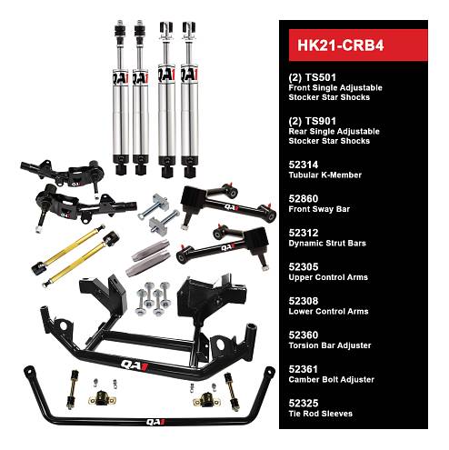 {"id":7665737728225,"title":"QA1 HK21-CRB4 Handling Kit Level 1 Mopar 71-72 B-Body","handle":"qa1hk21-crb4","description":"\u003cp class=\"MsoNormal\" style=\"mso-margin-top-alt: auto; mso-margin-bottom-alt: auto; line-height: normal;\"\u003e\u003cspan style=\"font-size: 12.0pt; font-family: 'Times New Roman',serif; mso-fareast-font-family: 'Times New Roman'; color: black;\"\u003eQA1 designed their HK21-CRB4 Handling Level 1 Suspension Kit to fit the Mopar 1971 through 1972 B-Body. This Level 1 handling kit includes spring rates to maximize performance while maintaining a smooth, comfortable ride.\u003c\/span\u003e\u003cspan style=\"font-size: 13.5pt; font-family: 'Segoe UI',sans-serif; mso-fareast-font-family: 'Times New Roman'; color: black;\"\u003e\u003c\/span\u003e\u003c\/p\u003e\n\u003cp class=\"MsoNormal\" style=\"mso-margin-top-alt: auto; mso-margin-bottom-alt: auto; line-height: normal;\"\u003e\u003cb\u003e\u003cu\u003e\u003cspan style=\"font-size: 12.0pt; font-family: 'Times New Roman',serif; mso-fareast-font-family: 'Times New Roman'; color: black;\"\u003eQA1 HK21-CRB4 Handling Level 1 Mopar 1971-72 B-Body Suspension Kit Includes:\u003c\/span\u003e\u003c\/u\u003e\u003c\/b\u003e\u003cspan style=\"font-size: 13.5pt; font-family: 'Segoe UI',sans-serif; mso-fareast-font-family: 'Times New Roman'; color: black;\"\u003e\u003c\/span\u003e\u003c\/p\u003e\n\u003cul type=\"disc\"\u003e\n\u003cli class=\"MsoNormal\" style=\"color: black; mso-margin-top-alt: auto; mso-margin-bottom-alt: auto; line-height: normal; mso-list: l0 level1 lfo1; tab-stops: list .5in;\"\u003e\u003cspan style=\"font-size: 12.0pt; font-family: 'Times New Roman',serif; mso-fareast-font-family: 'Times New Roman';\"\u003e(2) TS501 Front Single Adjustable Stocker Star Shocks\u003c\/span\u003e\u003c\/li\u003e\n\u003cli class=\"MsoNormal\" style=\"color: black; mso-margin-top-alt: auto; mso-margin-bottom-alt: auto; line-height: normal; mso-list: l0 level1 lfo1; tab-stops: list .5in;\"\u003e\u003cspan style=\"font-size: 12.0pt; font-family: 'Times New Roman',serif; mso-fareast-font-family: 'Times New Roman';\"\u003e(2) TS901 Rear Single Adjustable Stocker Star Shocks\u003c\/span\u003e\u003c\/li\u003e\n\u003cli class=\"MsoNormal\" style=\"color: black; mso-margin-top-alt: auto; mso-margin-bottom-alt: auto; line-height: normal; mso-list: l0 level1 lfo1; tab-stops: list .5in;\"\u003e\u003cspan style=\"font-size: 12.0pt; font-family: 'Times New Roman',serif; mso-fareast-font-family: 'Times New Roman';\"\u003e52314 Tubular K-Member\u003c\/span\u003e\u003c\/li\u003e\n\u003cli class=\"MsoNormal\" style=\"color: black; mso-margin-top-alt: auto; mso-margin-bottom-alt: auto; line-height: normal; mso-list: l0 level1 lfo1; tab-stops: list .5in;\"\u003e\u003cspan style=\"font-size: 12.0pt; font-family: 'Times New Roman',serif; mso-fareast-font-family: 'Times New Roman';\"\u003e52860 Front Sway Bar\u003c\/span\u003e\u003c\/li\u003e\n\u003cli class=\"MsoNormal\" style=\"color: black; mso-margin-top-alt: auto; mso-margin-bottom-alt: auto; line-height: normal; mso-list: l0 level1 lfo1; tab-stops: list .5in;\"\u003e\u003cspan style=\"font-size: 12.0pt; font-family: 'Times New Roman',serif; mso-fareast-font-family: 'Times New Roman';\"\u003e52312 Dynamic Strut Bars\u003c\/span\u003e\u003c\/li\u003e\n\u003cli class=\"MsoNormal\" style=\"color: black; mso-margin-top-alt: auto; mso-margin-bottom-alt: auto; line-height: normal; mso-list: l0 level1 lfo1; tab-stops: list .5in;\"\u003e\u003cspan style=\"font-size: 12.0pt; font-family: 'Times New Roman',serif; mso-fareast-font-family: 'Times New Roman';\"\u003e52305 Upper Control Arms\u003c\/span\u003e\u003c\/li\u003e\n\u003cli class=\"MsoNormal\" style=\"color: black; mso-margin-top-alt: auto; mso-margin-bottom-alt: auto; line-height: normal; mso-list: l0 level1 lfo1; tab-stops: list .5in;\"\u003e\u003cspan style=\"font-size: 12.0pt; font-family: 'Times New Roman',serif; mso-fareast-font-family: 'Times New Roman';\"\u003e52308 Lower Control Arms\u003c\/span\u003e\u003c\/li\u003e\n\u003cli class=\"MsoNormal\" style=\"color: black; mso-margin-top-alt: auto; mso-margin-bottom-alt: auto; line-height: normal; mso-list: l0 level1 lfo1; tab-stops: list .5in;\"\u003e\u003cspan style=\"font-size: 12.0pt; font-family: 'Times New Roman',serif; mso-fareast-font-family: 'Times New Roman';\"\u003e52360 Torsion Bar Adjuster\u003c\/span\u003e\u003c\/li\u003e\n\u003cli class=\"MsoNormal\" style=\"color: black; mso-margin-top-alt: auto; mso-margin-bottom-alt: auto; line-height: normal; mso-list: l0 level1 lfo1; tab-stops: list .5in;\"\u003e\u003cspan style=\"font-size: 12.0pt; font-family: 'Times New Roman',serif; mso-fareast-font-family: 'Times New Roman';\"\u003e52361 Camber Bolt Adjuster\u003c\/span\u003e\u003c\/li\u003e\n\u003cli class=\"MsoNormal\" style=\"color: black; mso-margin-top-alt: auto; mso-margin-bottom-alt: auto; line-height: normal; mso-list: l0 level1 lfo1; tab-stops: list .5in;\"\u003e\u003cspan style=\"font-size: 12.0pt; font-family: 'Times New Roman',serif; mso-fareast-font-family: 'Times New Roman';\"\u003e52325 Tie Rod Sleeves\u003c\/span\u003e\u003c\/li\u003e\n\u003c\/ul\u003e\n\u003cp class=\"MsoNormal\" style=\"mso-margin-top-alt: auto; mso-margin-bottom-alt: auto; line-height: normal;\"\u003e\u003cb\u003e\u003cu\u003e\u003cspan style=\"font-size: 12.0pt; font-family: 'Times New Roman',serif; mso-fareast-font-family: 'Times New Roman'; color: black;\"\u003eFitment Notes:\u003c\/span\u003e\u003c\/u\u003e\u003c\/b\u003e\u003cspan style=\"font-size: 12.0pt; font-family: 'Times New Roman',serif; mso-fareast-font-family: 'Times New Roman'; color: black;\"\u003e Torsion bar parts included in the Level 1 kits are NOT compatible with QA1’s coil-over conversion systems. If you plan to upgrade to coil-overs in the future, we recommend starting with those systems right away.\u003c\/span\u003e\u003cspan style=\"font-size: 13.5pt; font-family: 'Segoe UI',sans-serif; mso-fareast-font-family: 'Times New
